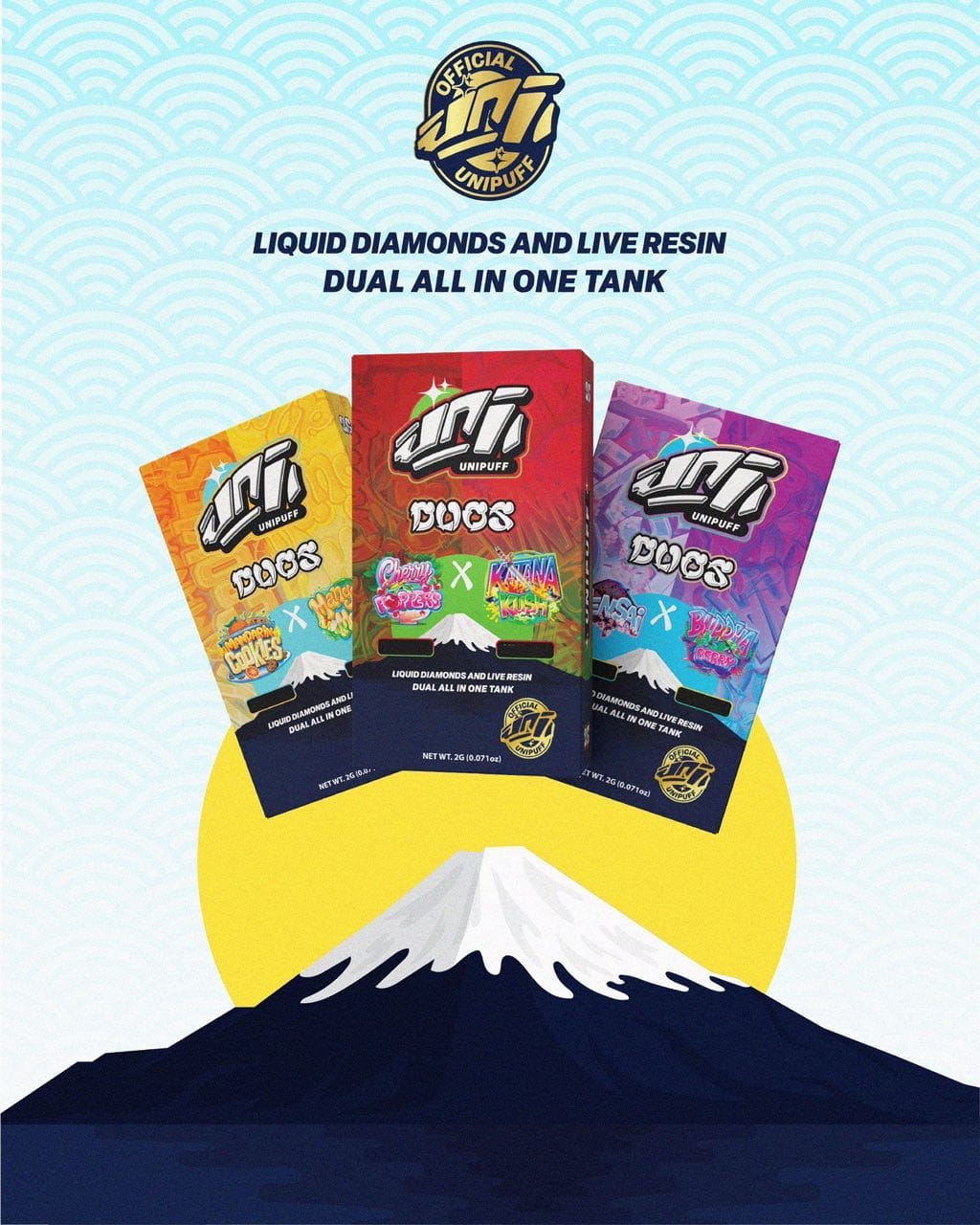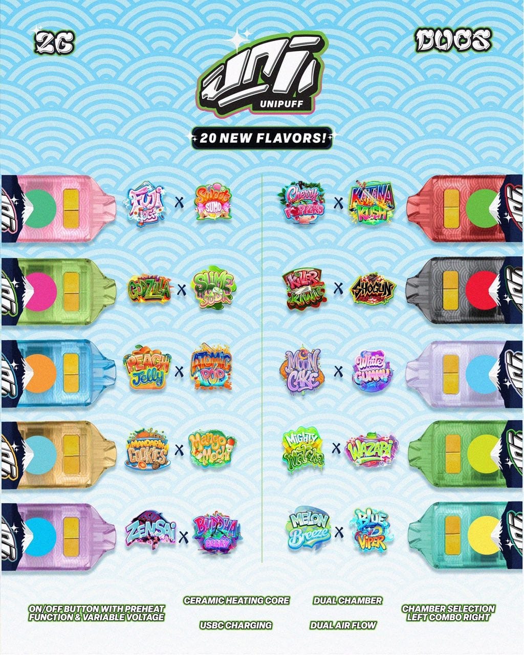 Flavors | fuji og x sweet sumo, godzilla x slime soda, peach jelly x atomic pop, mandarina cookies x mango mochi, zensai x budda berry, cherry poppers x katana kush, killer kiwi x shogun, moon cake x white gummy, mighty matcha x wazabi, melon breeze x blue viper |